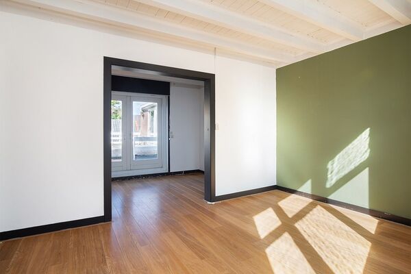 De bovenwoning met een trapopgang aan de straat biedt op de eerste verdieping een knusse, gezellige woonkamer en daarnaast een eetkeuken. Tevens bevindt zich hier de badkamer en apart toilet. Aan de achterzijde is een groot, goed op de zon gericht (zuidwest) dakterras van ca. 70 m2.