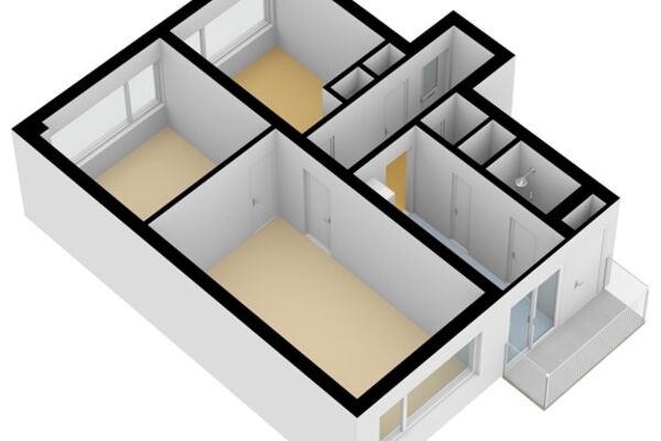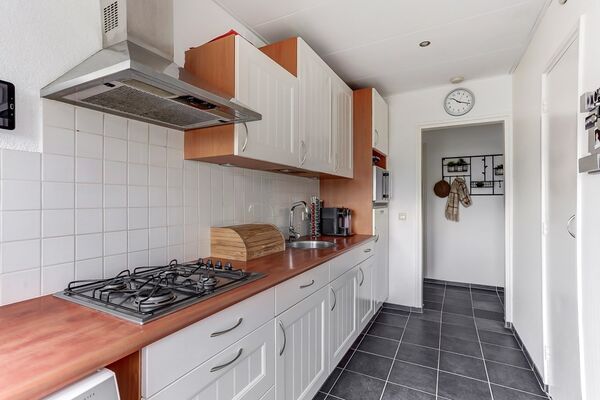 Entree/hal met meterkast, toiletruimte, open keuken met inbouwapparatuur inclusief was-droogcombinatie machine en inbouwkast. Vanuit de keuken is er toegang tot de badkamer en het balkon. Vanaf het balkon is de goed onderhouden boiler bereikbaar. De badkamer beschikt over een instapdouche en wastafelmeubel. Vanaf de hal zijn ook de slaapkamer en de woonkamer te betreden. De slaapkamer beschikt over een inbouwkast. Via de woonkamer is de tweede slaapkamer te bereiken. Een slaapkamer die ook prima fungeert als bijv. studeerkamer. De hal, de keuken, het toilet en de badkamer bevatten tegelvloer, op de slaapkamer ligt vloerbedekking en in de woonkamer en studeerkamer ligt laminaat van prima staat. Het appartement is voorzien van dubbel glas.