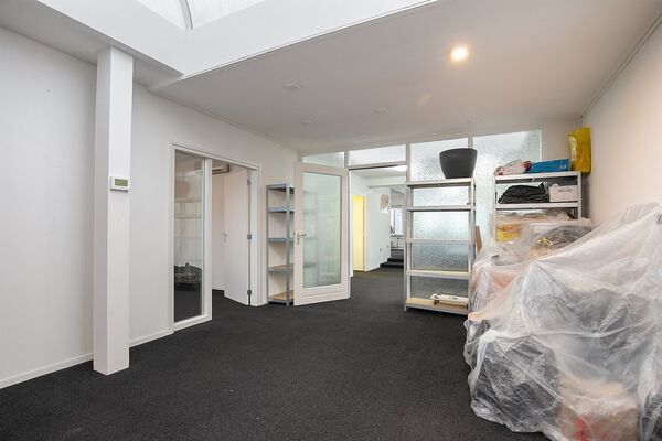 In het achterste deel zijn een ruime, (woon)kamer met grote lichtkoepels en twee inpandige werkkamers. Een van de werkkamers is te bereiken via een portaal waaraan een berging en een toiletruimte grenzen. In de berging hangt de HR-ketel (Remeha Avanta 35C CW5, 2020). Nagenoeg de hele begane grond is voorzien van een nette vloerbedekking.
