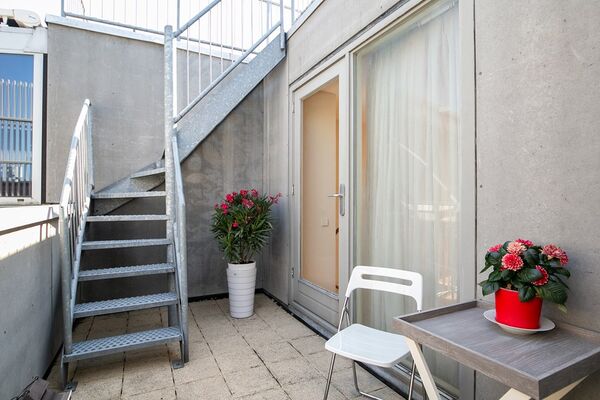Teven hebben we het zonnige dak terras op de vierde verdieping als men wat meer privacy en een extra mooie ruimte voor buiten wilt creeren.
