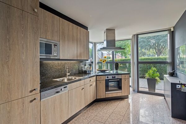 De halfopen woonkeuken, voorzien van een schiereiland, biedt een uitnodigende ruimte voor culinaire avonturen. Het keukengedeelte is uitgerust met moderne inbouwapparatuur, waaronder een inductiekookplaat, heteluchtoven, magnetron, koelkast, vriezer en vaatwasser. De erker zorgt voor extra lichtinval en geeft de keuken een bijzondere uitstraling.