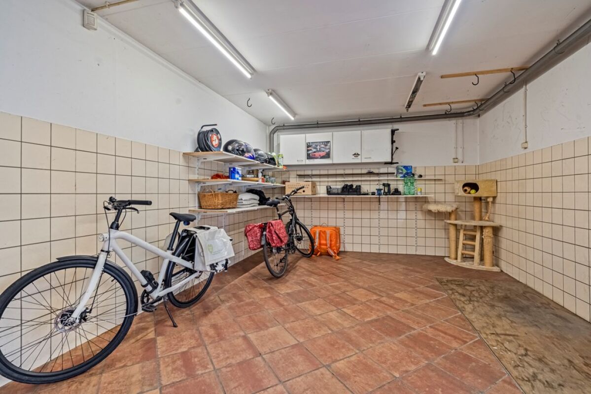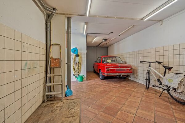 Een belangrijk pluspunt is de ruime, 9,6 meter lange garage, die vastzit aan het huis (en de buren) en voorzien is van een elektrische poort. De garage is ook toegankelijk via een deur op het terras aan de zijkant, en je kunt rechtstreeks vanuit de garage via een trap naar de kelder. Dit maakt de ruimte uiterst functioneel en geschikt voor allerlei doeleinden.