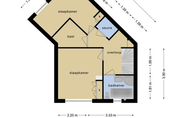 Eerste verdieping achterzijde : ruime overloop met infrarood sauna, l- vormige slaapkamer(oorspronkelijk 2 slaapkamers, makkelijk terug te bouwen) en een inloopkast. Aan de voorzijde: royale slaapkamer met airconditioning, vaste kastenwand, betegelde badkamer met ligbad, douchecabine, toilet en wastafelmeubel.