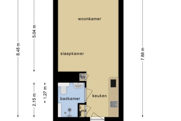 De woon-/slaapkamer is een heerlijke plek om te wonen, eten, loungen en slapen. Door de grote ramen valt veel licht naar binnen en een schuifpui geeft toegang tot de loggia. In de studio is genoeg plek voor een bank, tv-meubel, garderobekast, eettafel en een full-size tweepersoonsbed.