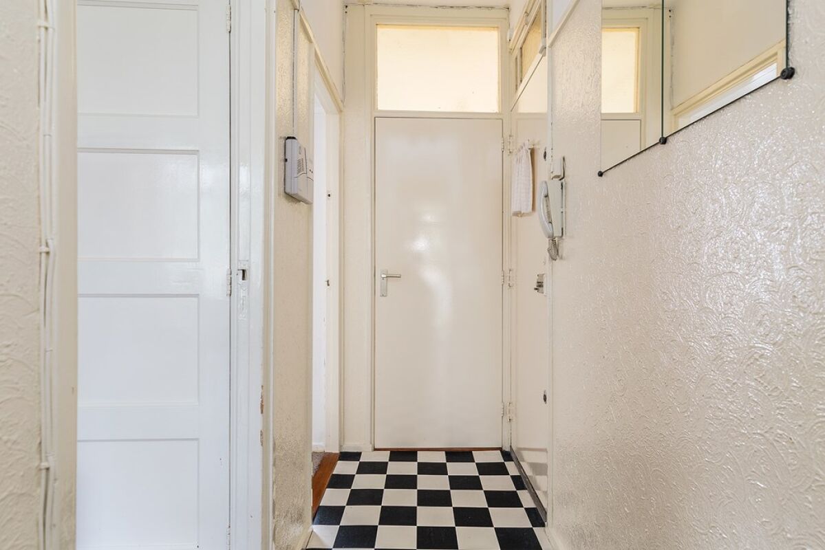 Entree appartement. Op de eerste woonlaag via de gang, toegang tot de woonkamer, twee slaapkamers, de keuken en badkamer.