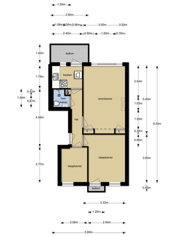 De keuken is aan de achterzijde en heeft een hoekopstelling met bovenkasten en is voorzien van een gastoestel met afzuigkap, koelkast en aansluiting voor een wasmachine. Vanuit de keuken bereik je het balkon aan de achterzijde waar je met z’n tweeën prima kunt zitten; dankzij de ligging op het westen zit je hier in de middag en avond lekker in het zonnetje uitkijkend over het plantsoen. De grote slaapkamer is aan de voorzijde en voorzien van praktische bovenkasten en deur naar het balkon met leuk uitzicht over onder andere je eigen tuin. Deze kamer heeft een afmeting van ca 3,80m x 2,94 m. De tweede slaapkamer is kleiner en heeft een groot raam aan de voorzijde, zou eventueel perfect kunnen dienen als studeerkamer en is ca. 2,77m x 2,06 m. Tenslotte de badkamer; de wanden zijn gedeeltelijk voorzien van tegels en de ruimte is ingedeeld met een douche, toilet en een wastafel.