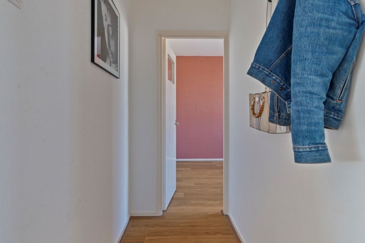 De entree leidt direct naar een lichte hal die toegang geeft tot de woonkamer en de keuken.