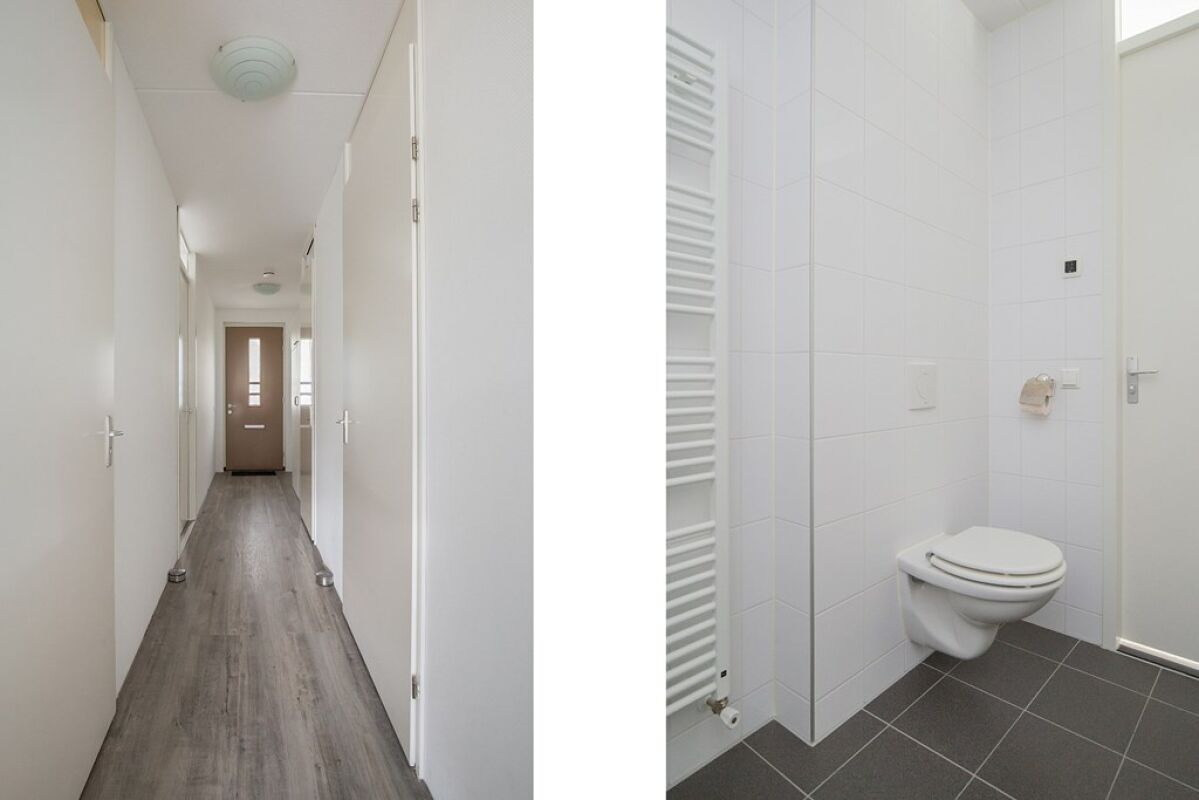 Voortuin met entree, hal met de meterkast en bergruimte met aansluiting voor een wasmachine, droger en de opstelling van de cv-ketel. De slaapkamer is licht en ruim genoeg voor een grote kastenwand. Er is een nette moderne badkamer, die is licht betegeld met douchecabine, wastafel en toilet.