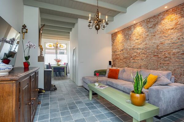 Dankzij de grote uitbouw is de woonkamer met halfopen keuken bijna 12 meter diep. Je oog valt op de mooie tegelvloer, het balkenplafond, de glas-in-lood ramen en de ruwe metselmuur die goed passen bij de gestucte muren. Aan de voorzijde is de eetkamer, onder de trap is een handige bergkast en in de woonkamer is plek voor een grote bank. Leuk detail is de schouw met een eikenhouten balk en de antieke Franse houtkachel, waardoor je in deze woning kunt genieten van een sfeervol haardvuur.