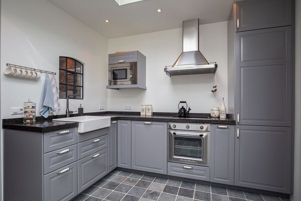 Aan de tuinzijde is de lichte keuken met recent vernieuwde openslaande tuindeuren, een grote lichtstraat en een origineel stalraam aan de kant van de woonkamer. De keuken heeft een grijze hoekopstelling (2021) met een Belgisch hardstenen blad, porseleinen gootsteen en alle benodigde inbouwapparatuur: een inductiekookplaat, afzuigkap, oven, magnetron, koel-/vriescombinatie en een XL-vaatwasser. Achter de rode deur is de moderne toiletruimte met een wandcloset en een natuurstenen fonteintje.
