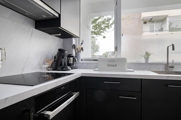 Entree, ruime hal met garderobe, luxe geheel betegeld toilet en trapopgang. Open woonkeuken met veel lichtinval en luxe keukeninrichting voorzien van een inductie kookplaat, heteluchtoven, combimagnetron, koelkast, vriezer en vaatwasmachine. De gehele begane grond is voorzien van een houten laminaten vloer.