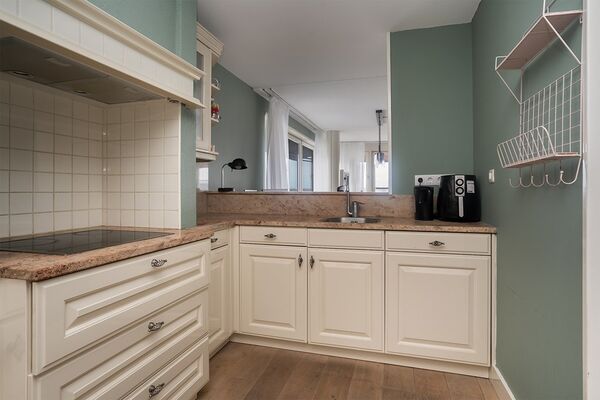 Eenmaal in de woonkamer wordt je blik meteen naar buiten getrokken. Dit is echt genieten. Maar ook binnen heeft het appartement veel te bieden. Het penthouse is strak afgewerkt met daarin een moderne witte keuken die ook van alle gemakken is voorzien. Via de keuken heb je de toegang tot de bijkeuken waar veel praktische opbergruimte is.