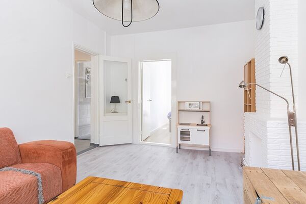 Entree, hal met stenen gietvloer. Ruime doorzon woonkamer van voor naar achter. Naastgelegen is de keuken. Voorzien van een keukenunit met een gaskookplaat, CV ketel en toegang tot het balkon (gerenoveerd). De badkamer heeft de toegang vanuit de keuken en is voorzien van driekwart betegelde wanden, een douche en een vaste wastafel. De badkamer is gedeeltelijk voorzien van een mooie graniet vloer met opstaande randen en een stenen gietvloer.