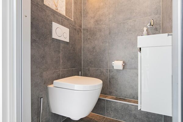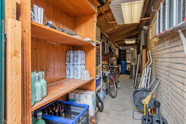 Begane grond: binnenkomst via de hal met meterkast (8 groepen), toilet met fonteintje, ruime voorraadkast, open trap naar 1ste verdieping, woonkamer op laminaatvloer met vloerverwarming, airco en openslaande deuren naar de tuin toe (zuid gelegen), moderne keuken op laminaatvloer met vloerverwarming, volledig uitgerust met luxe inbouwtoestellen (vaatwasser, grote oven met pyrolyse systeem, moderne afzuigkap, breed 5 pits gasfornuis met wokbrander), toegang tot achtertuin met 2 schuren. De tuin is ook te bereiken via een zijpoort.