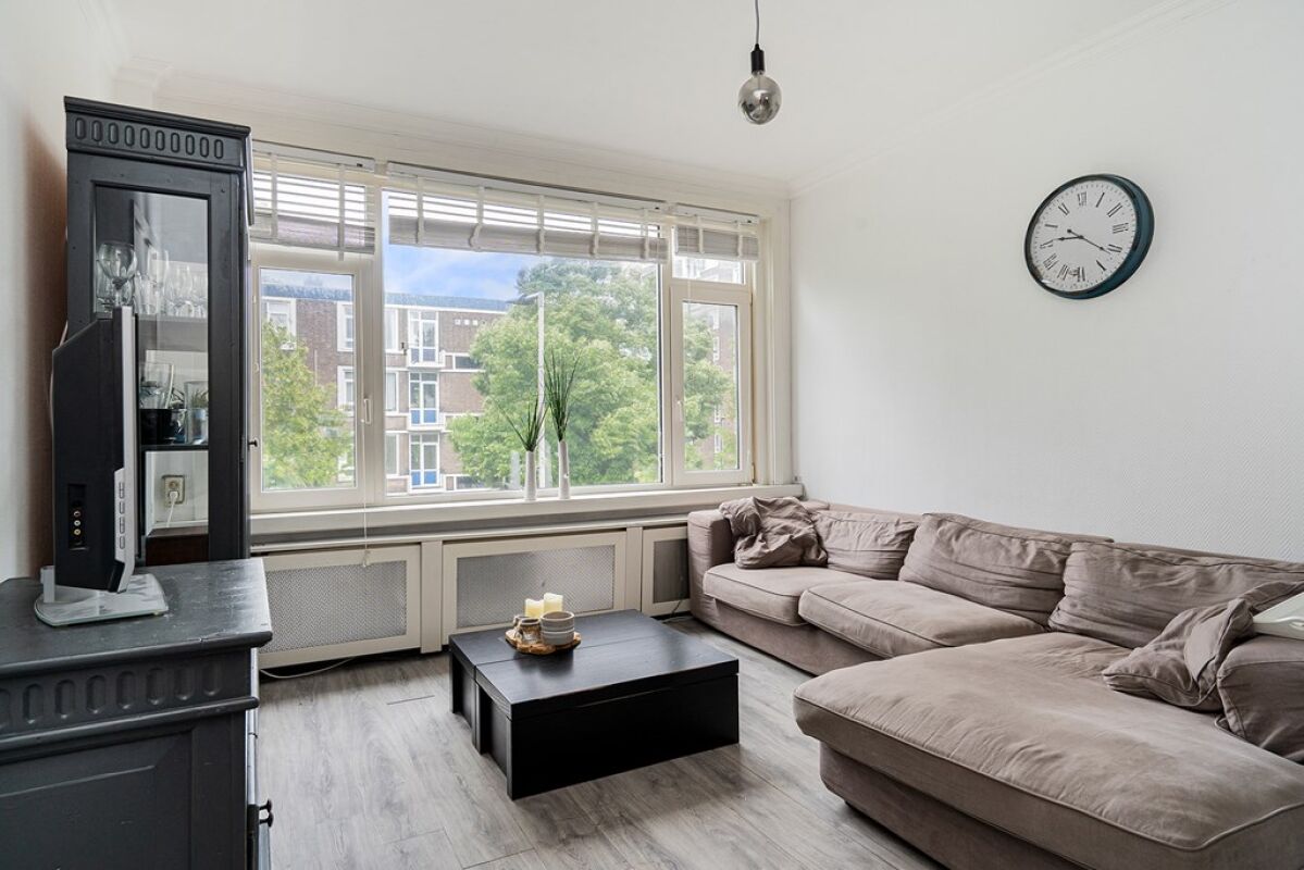 De ruim 6.70 meter diepe woonkamer heeft twee vaste kasten met paneeldeuren en een mooie verdeling tussen het zit- en eetgedeelte. Door de grote ramen heb je mooi uitzicht naar de hoge bomen in de brede straat.