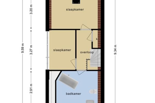 Verrassend is de indeling op de eerste verdieping. Er zijn twee ruime slaapkamers, een vaste kast en vanaf de overloop is ook de zeer ruime badkamer te bereiken.