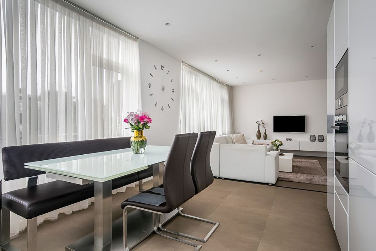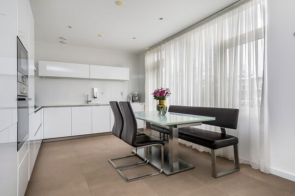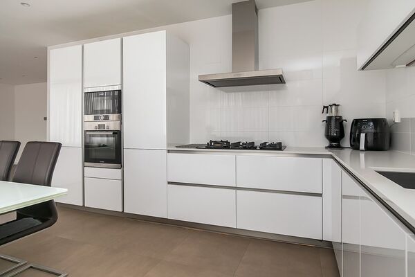De open keuken is tevens met veel lichtinval en van luxe keukeninrichting voorzien van een gaskookplaat, afzuigkap, heteluchtoven, magnetron, koelkast, vriezer en vaatwasmachine.