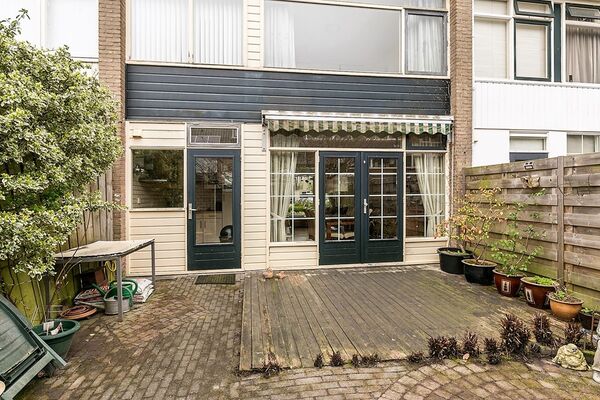 De achtertuin is voorzien van een stenen berging, buitenkraan, zonwering en elektra. De tuin is bereikbaar via de keuken, de openslaande deuren van de woonkamer en achterom.