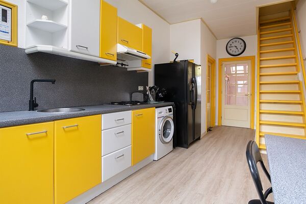 Separate voordeur met klein halletje met kapstok. Woonkamer voorzien van plavuizen. Keuken met laminaat en voorzien van 4-pits gaskookstel, Amerikaanse koelkast, vaatwasmachine en wasmachine. Deur vanuit de keuken naar buiten. Vanuit de keuken trapopgang naar grote lichte zolder, geschikt voor slaapkamer(s) of studeerkamer. De zolder is eveneens vanuit het achterhuis bereikbaar. Aansluitend aan de keuken een royale slaapkamer met separate badkamer voorzien van douchecabine, wastafel en toilet.