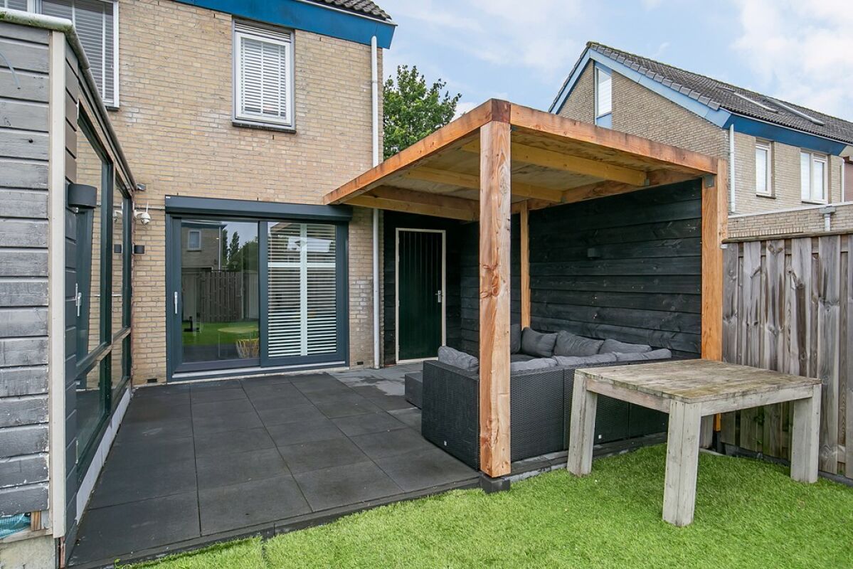 Ruime hoekwoning met een ruime tuin en overkapping.