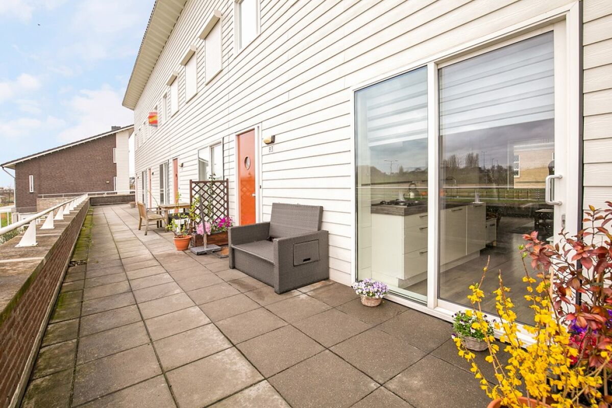 Buiten: het terras is gelegen op de tweede woonlaag aan een zeer zonnig en ruim, gezamenlijk woondek, gesitueerd op het zuidwesten. De woning is erg licht, mede door de glazen schuifpui aan de voorzijde en de grote raampartij aan de achterzijde. Aan de achterzijde van de woning ligt de straat, die van voldoende parkeervakken voorzien is.