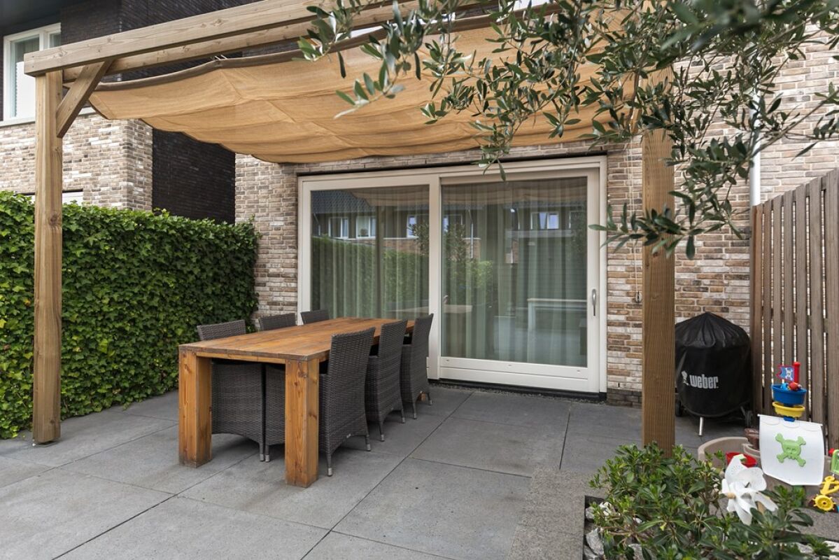 De sfeervolle, onderhoudsarme tuin (2016) gelegen op het westen is voorzien van alle luxe. Het beschikt over een prachtige Douglas houten pergola met Nesling doek, sfeerverlichting van In Lite met timerfunctie, een betegelde zithoek en elektra voorzieningen. De beplanting zorgt voor een mooi groene tuin het gehele jaar door met een gezellige Mediterraanse ambiance. Er is volledig betegeld met Oud Hollandse tegels van 1 x 1 m. De woning beschikt over een achterom en een ruime externe berging (8 m2). De afmetingen van de zonnige tuin zijn ca. 10,5 m lang x 5,5 m breed met een beschutte ligging.
