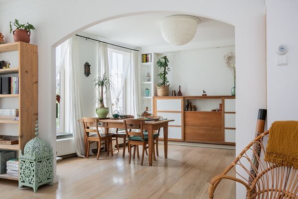 Ruime hal met lichte plavuizen, een vaste stoere garderobekast en intercom. Toegang tot alle vertrekken. Aan de voorzijde gelegen bijzonder ruime, lichte woon-/eetkamer met vaste kasten en ingebouwde nissen met sfeervolle dimbare inbouwverlichting, cv verwarming over de gehele breedte, 4 grote openslaande raampartijen HR ++. Originele brede granieten vensterbanken en een mooie lichteiken parketvloer.