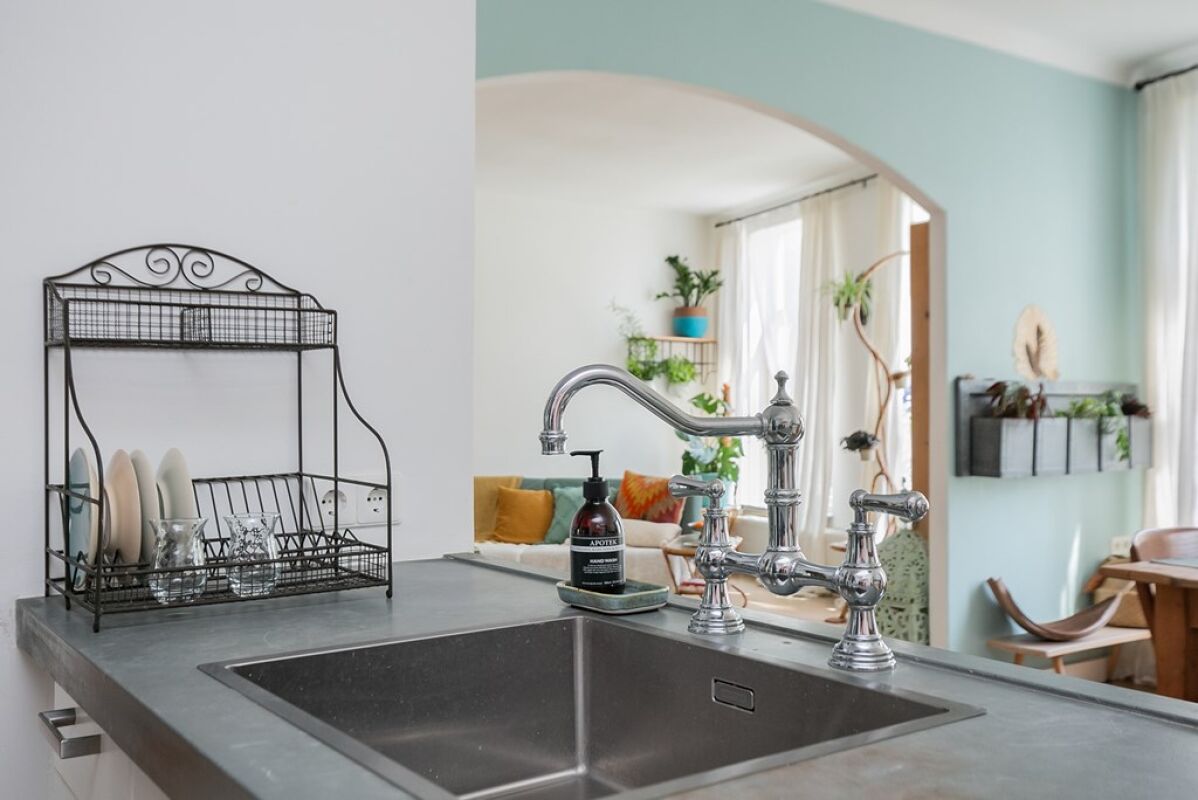 Aangrenzend tref je de U vormige keuken met Bosch inbouw apparatuur: rvs heteluchtoven, koelvriescombinatie, vaatwasser, brede rvs afzuigkap en een 4 pits gaskookplaat van Kuppersbusch. Een stoer dik aanrechtblad van composiet met rvs spoelbak en nostalgisch handgemaakt kraanwerk van Perrin & Rowe maken het geheel compleet.