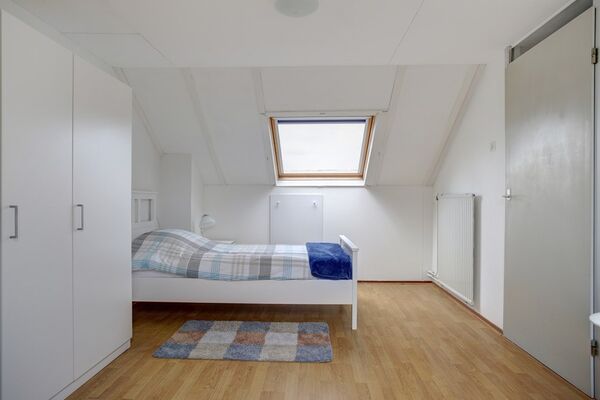 Slaapkamer 4: Ruime slaapkamer met radiator en dakraam aan de voor- en achterzijde. Veel extra bergruimte achter de knieschotten (ca 13,5 m2). Mogelijkheid tot vijfde slaapkamer en tweede badkamer.