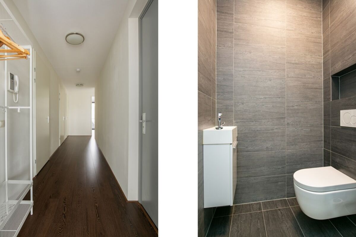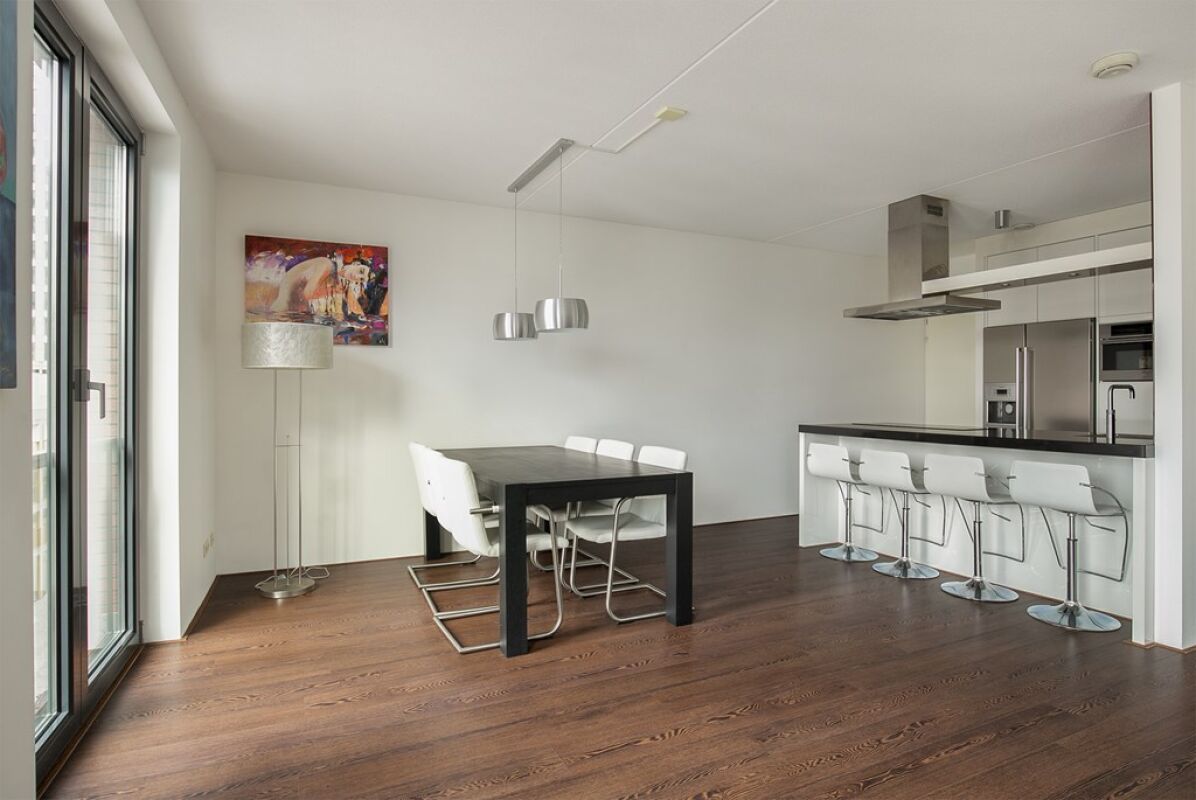 Entree met een lange, brede gang, waar alle binnenruimtes op zijn aangesloten. Een prachtige, brede woonkamer met uitzicht en veel licht inval. Een open keuken met Boretti inductie kookplaat, Boretti combi-magnetron, Boretti combi-oven, Amerikaanse koelkast, Quooker kraan, afzuigkap en vaatwasmachine. Een bijkeuken met aansluiting voor de wasmachine. Het toilet heeft een fonteinmeubel met mengkraan. De luxe, geheel betegelde badkamer heeft een bubbelbad, een dubbele douche, een dubbele wasbak, een tweede toilet en een schuifdeur naar de eerste slaapkamer. De eerste slaapkamer wordt gebruikt als masterbedroom en heeft genoeg ruimte voor een tweepersoonsbed en meerdere (kleding)kasten. De tweede slaapkamer met toegang tot het balkon, wordt momenteel gebruikt als werkkamer. De derde slaapkamer met toegang tot het balkon, wordt momenteel gebruikt als logeerkamer en er is ruim genoeg voor een bed (of een tweepersoons slaapbank) en een kledingkast.