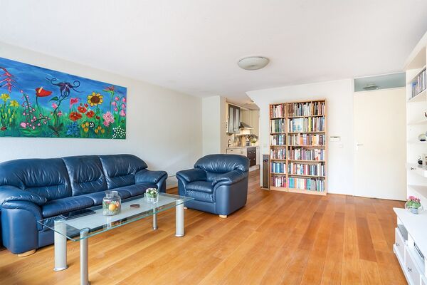 Dankzij de uitbouw is de woonkamer een stuk groter geworden. Door de grote ramen en de schuifpui valt veel licht naar binnen en doordat de eettafel in de eetkamer staat, kan de woonkamer van ruim 30 m² geheel als zitkamer worden ingericht.