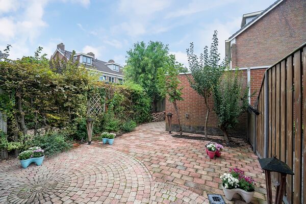 Vanuit de woonkamer loop je de achtertuin in, die voor een groot deel is bestraat. Hierdoor heb je genoeg ruimte om een lounge set neer te zetten. De beplanting is gevarieerd en in de stenen berging is ruimte voor de fietsen. Links van de berging is een poort naar de steeg.