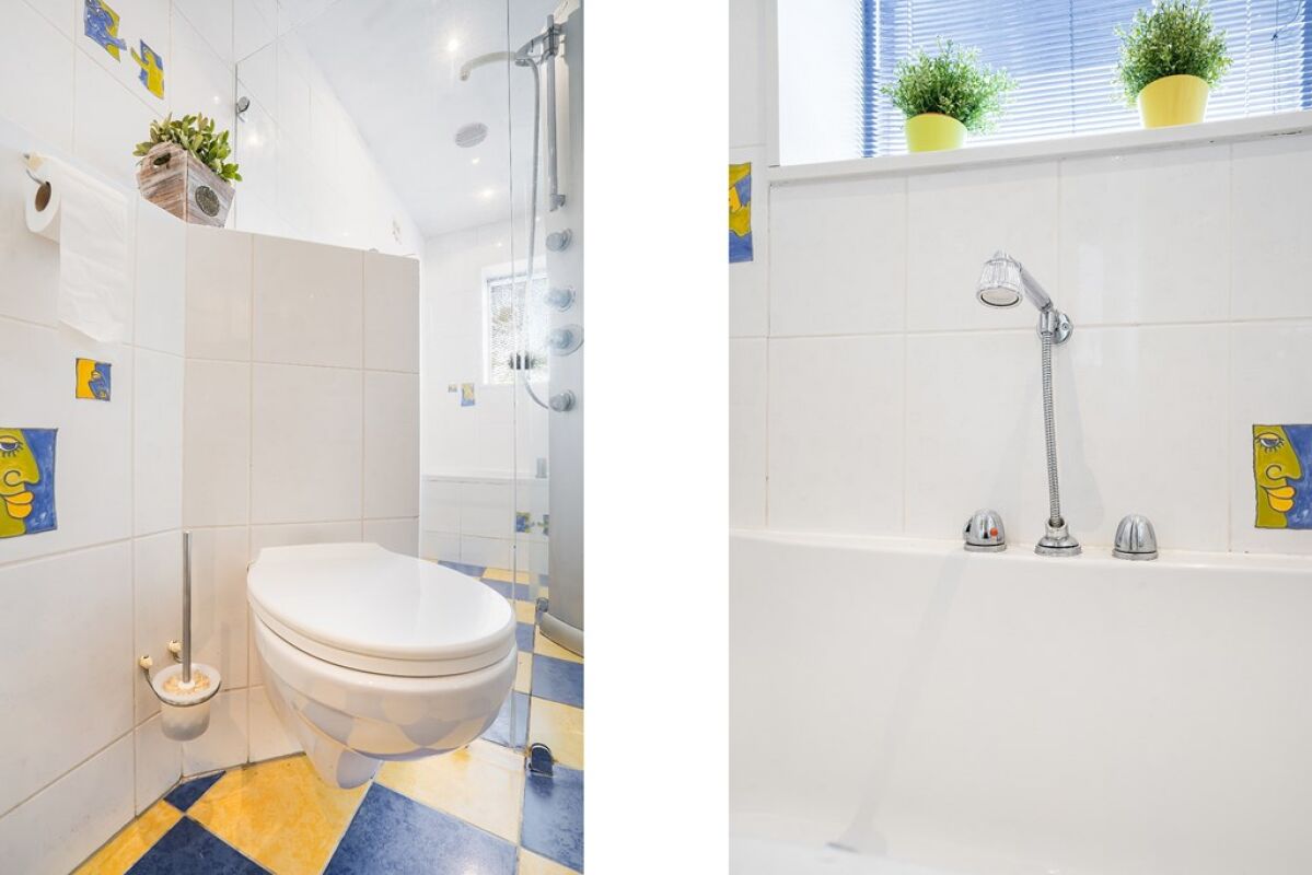 Aan de voorzijde, naast de hoofdslaapkamer, is de zeer ruime en kleurrijke badkamer. Gele en blauwe vloertegels vormen een mooie combinatie met de witte wandtegels, waar je soms een siertegel met geel en blauw ziet. De badkamer is ingedeeld met een whirlpoolbad, een inloopdouche met glazen wand, een tweede toilet, handdoekenradiator en twee wastafels met een marmeren blad. De spiegelkasten en twee hoge, witte kasten bieden veel bergruimte.