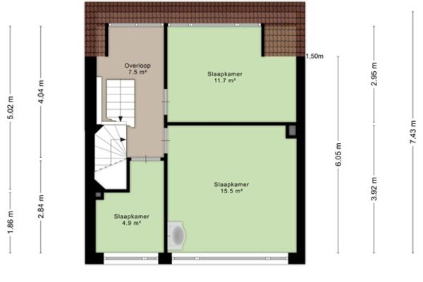 De tweede verdieping bevinden zich drie kamers van verschillende afmetingen waarvan twee volwaardige slaapkamers en een ruime overloop. Door de indeling en het beschikbare dakoppervlak is deze verdieping goed te gebruiken voor extra slaap-, werk- of hobbyruimtes.