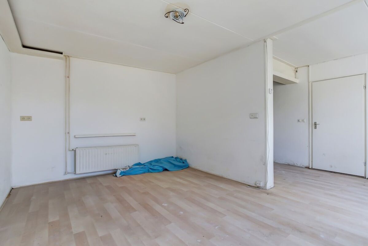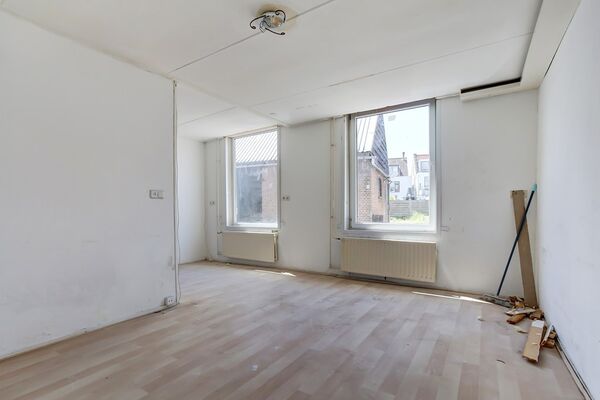 De woonkamer met open keuken heeft twee grote ramen aan de westkant waardoor veel lichtinval en leuk uitzicht hebt. Er is genoeg ruimte voor een grote zithoek en een eethoek in deze verrassend grote leefruimte. De keuken heeft een eenvoudige wandopstelling met enige inbouwapparatuur.