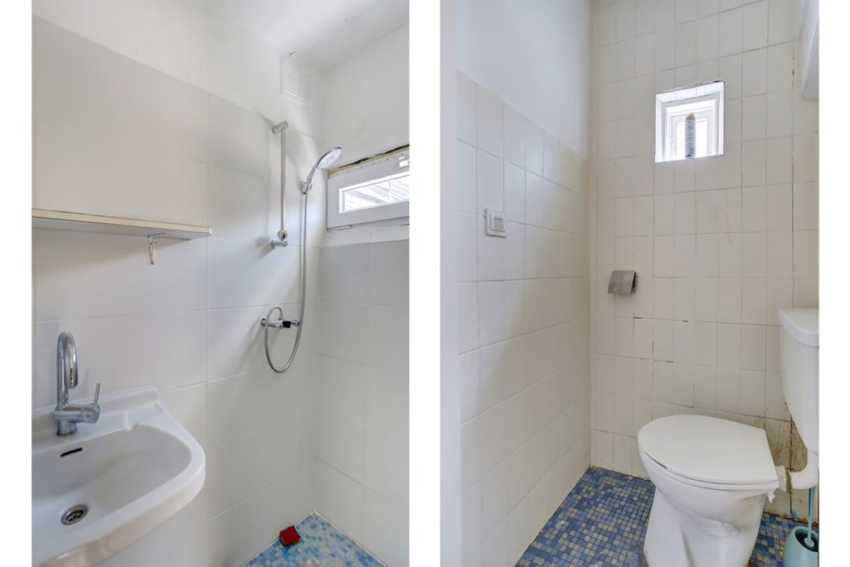 De badkamer en toiletruimte zijn in dezelfde stijl uitgevoerd met lichte tegels op de wanden en blauwe mozaïekstenen op de vloer. De badkamer is ingedeeld met een douche en een wastafel.
