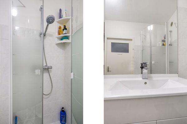 De laatste ruimte binnen is de badkamer, te bereiken vanuit de hal. In deze ruimte, onder de boiler, is plek voor de wasmachine. Verder zie je hier een wastafelmeubel met spiegel, een hoge kast en een kwartronde douche.
