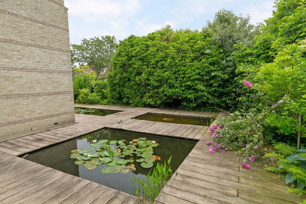 Onderhoudsvriendelijk en zonnig gelegen op het zuidwesten, v.v. composiet vlonders, bestrating (flagstones), plantenborders, vijverpartijen, buitenkraan, buitendouche, verwarmd zwembad (pomp onder buitendouche) en dubbele houten berging.