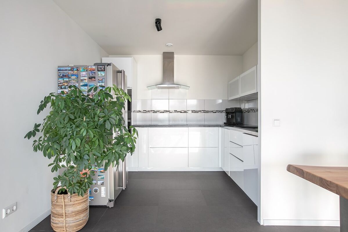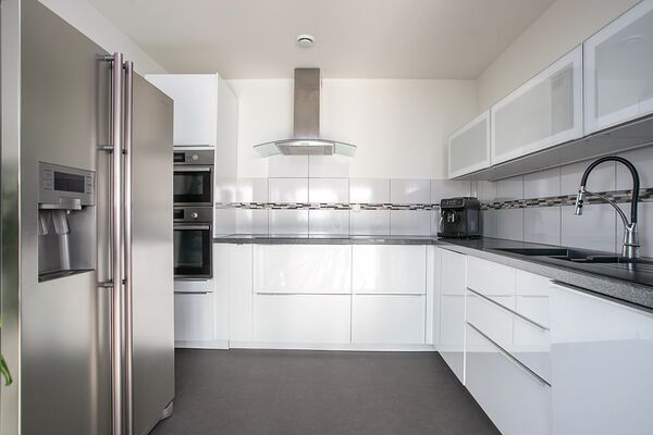 The open kitchen has a built-in kitchen in a corner with a stone worktop and of course the necessary built-in appliances: a dishwasher, ceramic hob, oven, refrigerator and modern extractor hood.