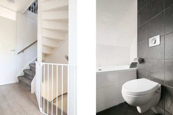 Stenen voortuin met aangrenzende stenen berging. De woning heeft een overdekte entree die toegang geeft tot de ruime hal met laminaat vloer en de met tapijt beklede trap naar de eerste verdieping. In de hal is de moderne toiletruimte en ruimte voor een schoenenkast en kapstok.