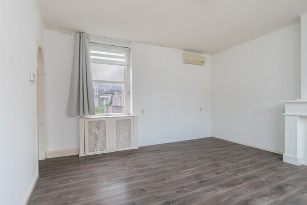 - Gezellige woonkamer met schouw, airco-installatie en open doorgang naar de hal.