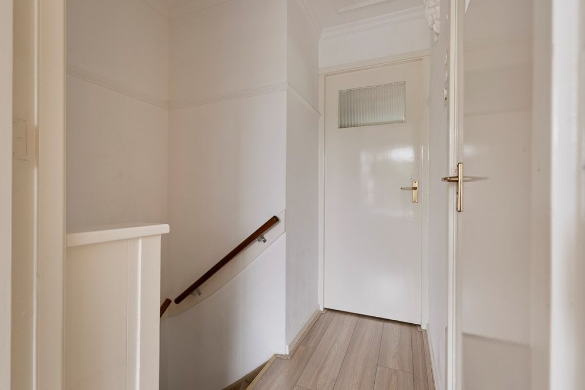 Via de trap in de hal bereik je de bovenverdieping, waar twee slaapkamers en een ruime badkamer zijn gesitueerd. De grote slaapkamer beschikt over een inbouwkast en een aangrenzend balkon, perfect om te genieten van een rustige ochtend met uitzicht. De tweede slaapkamer is praktisch ingericht en biedt ruimte voor een wasmachine en droger, keurig weggewerkt in inbouwkasten. De badkamer is luxe afgewerkt met een inloop-regendouche, whirlpoolbad, wastafel en toilet.