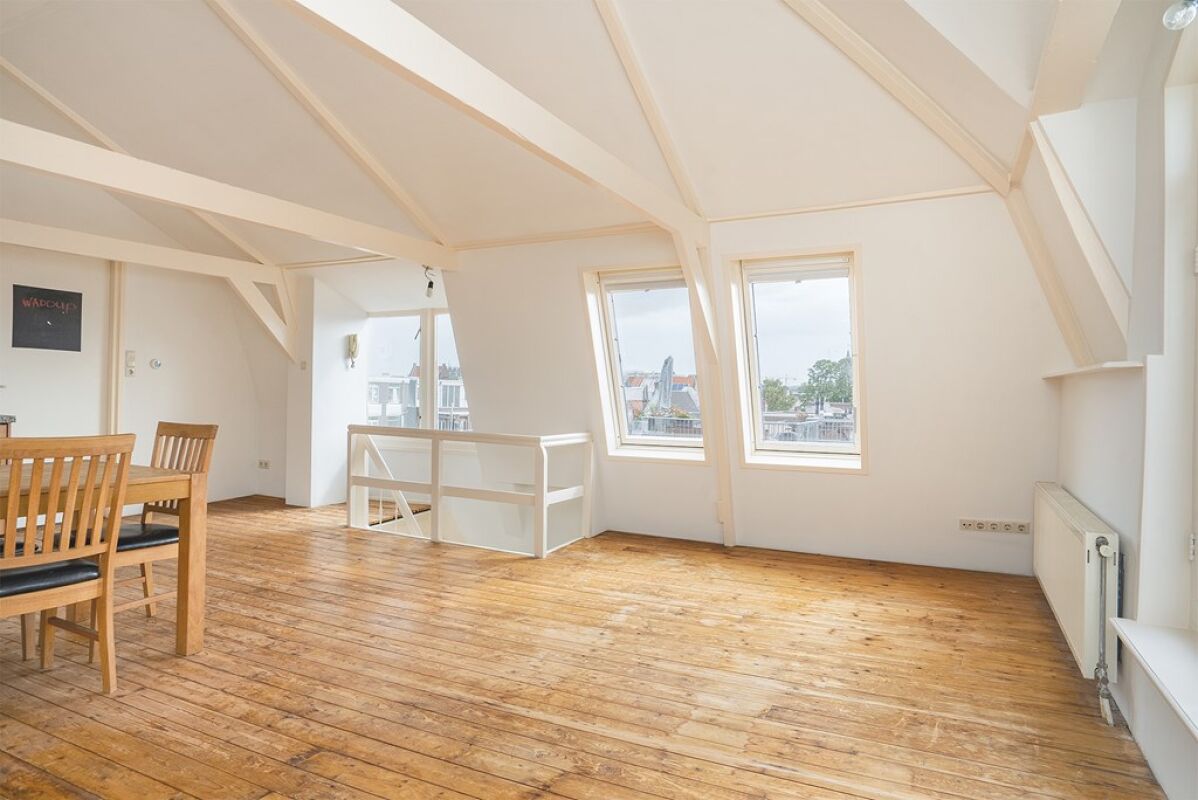 Beautifully light and attractively laid out apartment of 99 m2 in the heart of the Jordaan. This charming apartment has 2 spacious bedrooms, a large and bright living room and unobstructed views over the city. The house has beautiful light through the large windows and is decorated with authentic details, such as original wooden beams. This gives the house a lot of character. The apartment is located in a prime location, within walking distance of the Noordermarkt, the Nine Streets, the canal belt and the Westerpark.