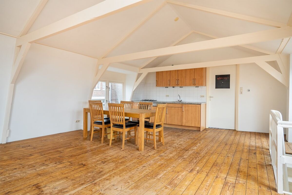 Door middel van de open trap komt u op de 4e verdieping terecht en die is overal voorzien van authentieke houten balken. Aan de voorzijde bevindt zicht de ruime eetkamer (of 2e woonkamer) met aansluitend de keuken met ingebouwde oven, vaatwasser en koelkast. De tweede slaapkamer met eigen WC bevindt zich aan de achterzijde van het appartement.