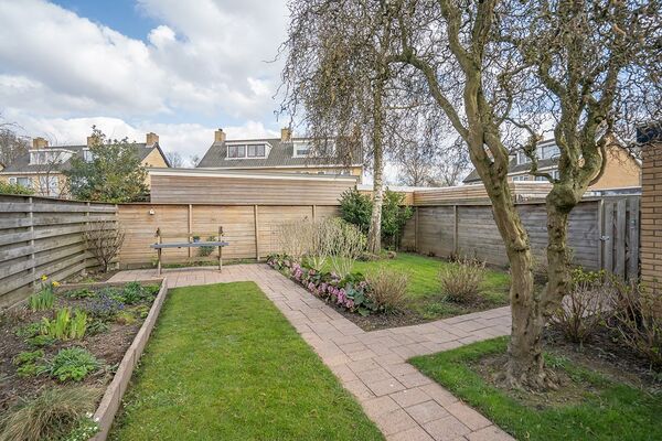 De fraai aangelegde achtertuin ligt op het oosten, de voorzijde kijkt uit op een groenstrook, waar aansluitend een speeltuin voor kinderen is aangelegd.