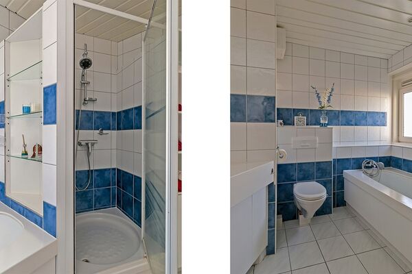 De royale badkamer is uitgevoerd met een 2e toilet, ruim ligbad, radiator, douchecabine, wastafel met wastafelmeubel en een spiegelkast.