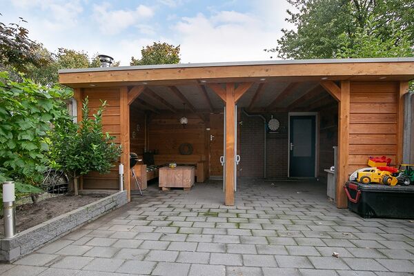 De royale tuin Is toegankelijk via de carport en voorzien van een luxe/gezellige veranda, inclusief houtkachel en hoekbank. Aan de achterzijde van de veranda treft u een carport voor 1 auto. Naast de carport is een handige extra berging gerealiseerd, voor o.a. opslag van bbq/fietsen.