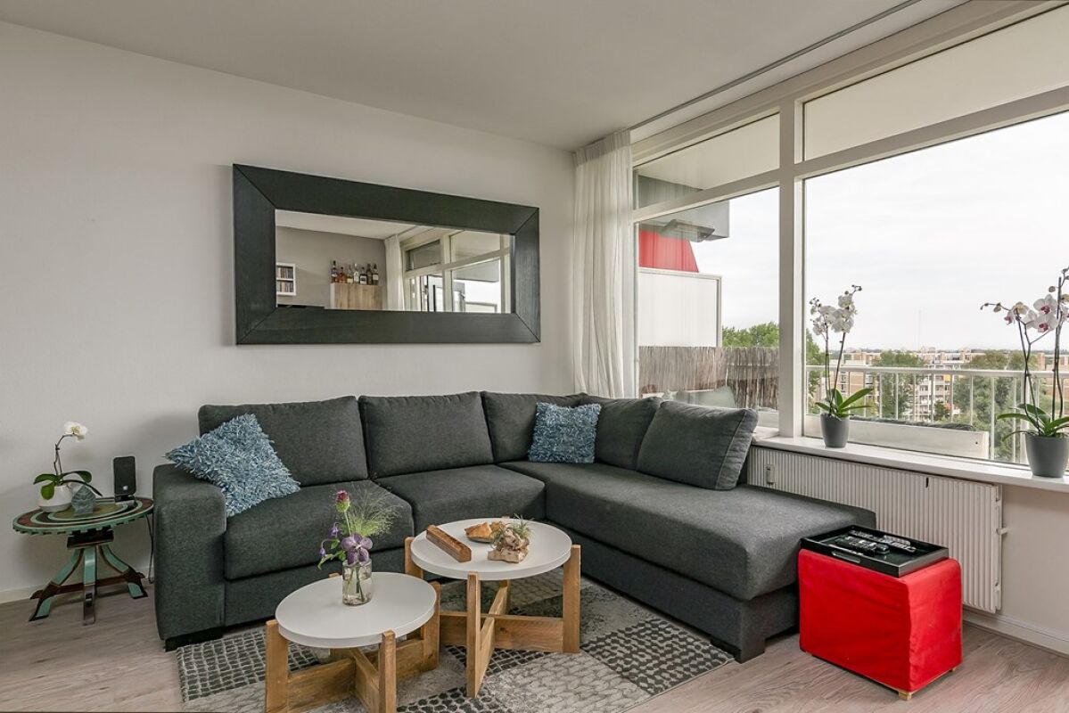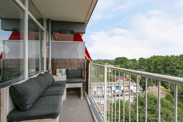 Een 'hoogtepunt' van dit appartement is het balkon. Vanaf de 8ste etage heb je een prachtig vrij uitzicht over het (groene) Beethovenplantsoen en kijk je uit over de rest van de stad en het Westland. Het balkon is voorzien van een steigerhouten lounge (hoek)bank met heerlijke kussens. Verder ontbreekt zelfs een heater niet zodat het ook tijdens een koudere zomeravond nog aangenaam is.
