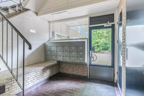 Op de begane grond is de entree van de appartementen Muldershof 46-62. Aan de buitenzijde zijn de brievenbussen, het bellentableau en de intercom. Vanuit de gezamenlijke hal ga je met de trap naar de eerste verdieping, waar dit lichte hoekappartement gesitueerd is. Bij het appartement hoort een eigen (fietsen)berging op de begane grond.