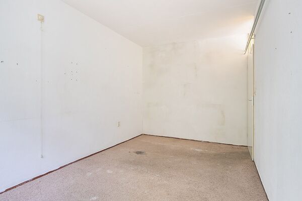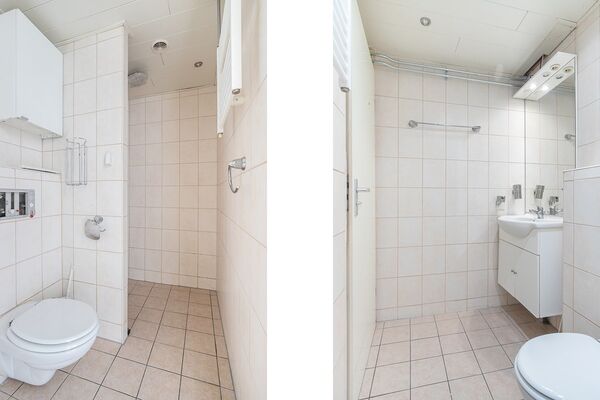 Niet alleen de woonkamer, maar ook de ruime slaapkamers bevindt zich aan de kant met het mooi uitzicht naar de bomen. De slaapkamer is groot genoeg voor een tweepersoonsbed, een garderobekast en zelfs een bureau. Naast de slaapkamer bevindt zich de badkamer, te bereiken vanuit de hal. Deze ruimte met een inloopdouche, toilet en wastafelmeubel is uitgevoerd in lichte kleuren.